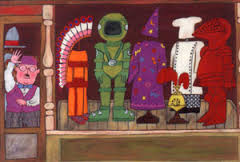 3. Return with the elixir – without exception, Mr Benn keeps a memento of his adventure, given by the shop-keeper: a stone age axe, a balloonist medal, a sheriff’s badge. He observes Festive Road with new eyes, his experience bringing a new understanding to the world (traffic is hazardous, whether it’s dinosaurs or cars; it’s better to play games together than wage war; cheaters never win).